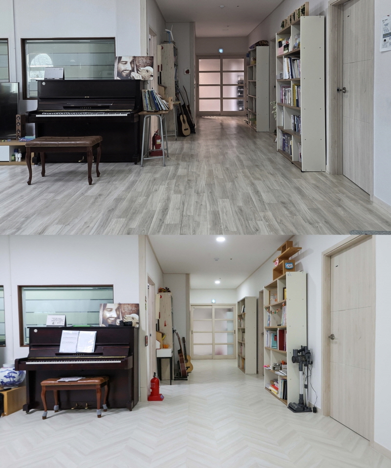 LX하우시스가 개보수 공사를 진행한 그룹홈 '좋은나무와 열매'의 리모델링 공사 전(사진 위)과 후 모습.