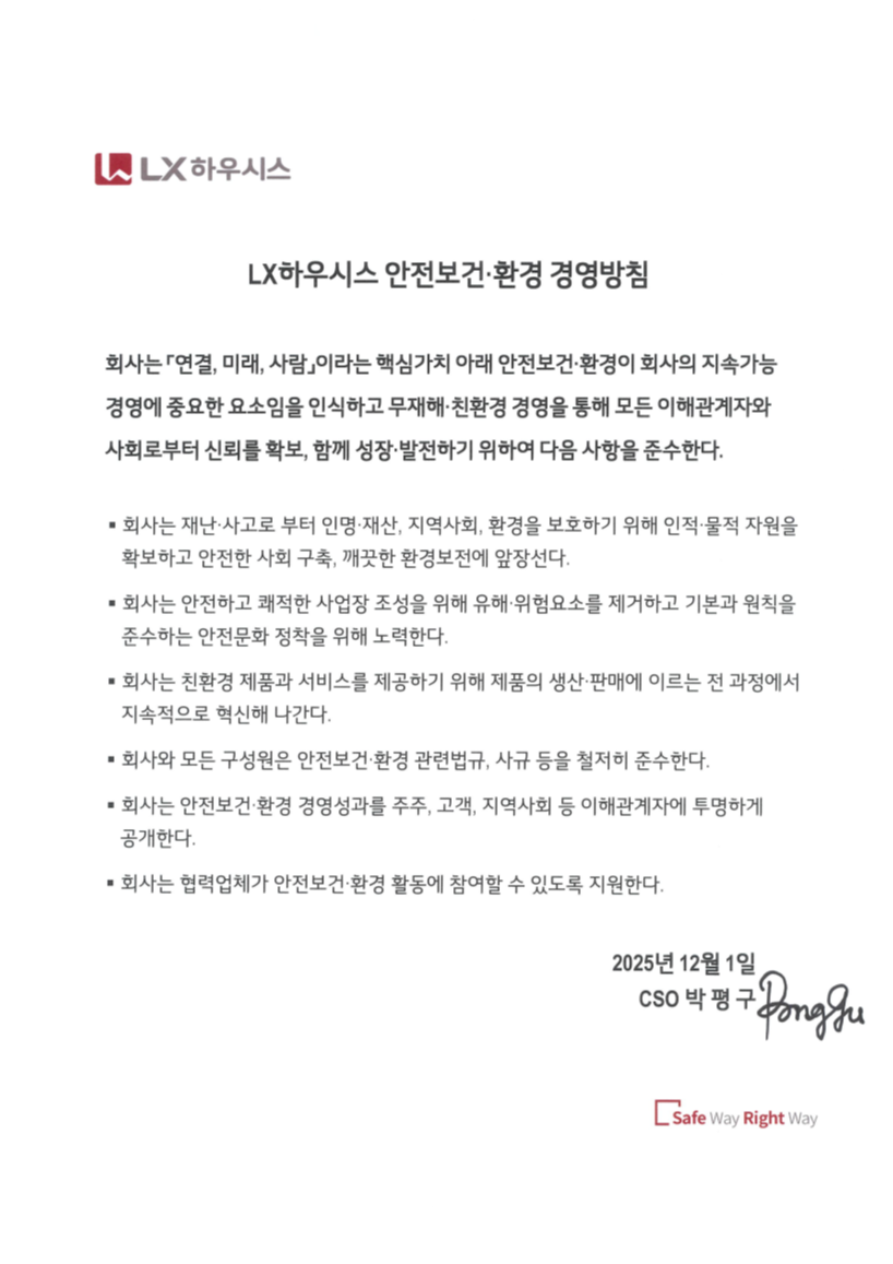 LX하우시스는 '사업 활동과 안전보건·환경과의 조화'라는 환경경영 비전을 달성하기 위해